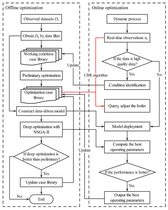 Structural diagram of the boiler online combustion optimization method. The red arrow in the figure indicates the application of optimization case library for online optimization.