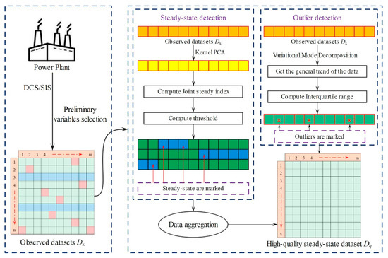 First, original data are collected from the plant’s supervisory information system (SIS) database. To obtain high-quality data samples that accurately reflect the static mechanism of the boiler combustion system, steady-state diagnosis and outlier detection are performed on the original observed data. Aiming at this process, a filter algorithm framework integrating steady-state diagnosis and outlier detection using a steady-state detection method based on kernel-PCA is proposed by comparing the joint steady index (JSI) with a given threshold and filtering the appropriate steady-state samples from the original observed data. In addition, the VMD algorithm is used to determine the data flow trend, and the outliers are determined by calculating the interquartile range to obtain the confidence interval. Finally, the data samples that passed the steady-state diagnosis and outlier detection are aggregated to form the high-quality steady-state dataset containing combustion system information.