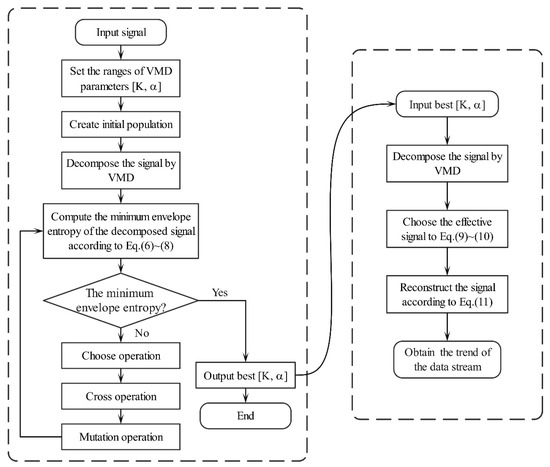 Variational Modal Decomposition (VMD) is a signal decomposition algorithm [25] that divides the original signal into multiple signals from the perspective of the frequency domain and can be used to distinguish between normal and abnormal data [26]. To reasonably select the parameters of the VMD algorithm, the minimum envelope entropy [27] is used as the objective function, and the genetic algorithm is used to identify the best parameter combination for achieving the best signal decomposition effect and ensuring trend extraction accuracy. The envelope entropy is mathematically defined as follows: