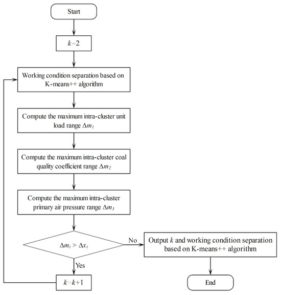K-means++ [28] is used to cluster the three parameters that can reflect the operating state of the boiler, unit load, coal quality coefficient, and primary air pressure to construct an initial working condition case library. To consider the impact of data distribution changes on the case library, a reclustering strategy for the online adaptive calculation of working condition clusters is proposed.