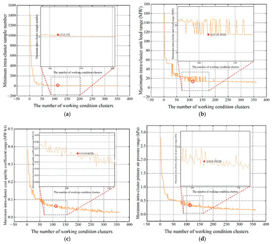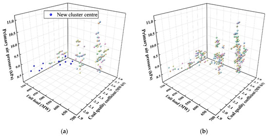 In this section, we verify the effectiveness of the proposed reclustering strategy. Figure 18a,b show the changes in the cluster center in the case library before and after the adaptive reclustering strategy, respectively. Due to the increasing richness of data samples in the case library during the online retrieval process, after reclustering, the data samples are divided into 313 working conditions. The maximum intracluster unit load range, the maximum intracluster coal quality coefficient range, and the maximum intracluster primary air pressure range are 13.2 MW, 0.049 MW∙h/t, and 0.206 kPa, respectively. The results show that the proposed reclustering strategy can satisfy the online adaptive computation and the range of 2~3% working condition parameters.