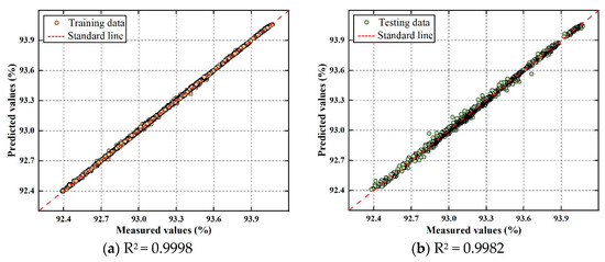 Figure 12 and Figure 13 show the predictive performance of the boiler efficiency model and NOx emission model on the training and testing datasets, respectively. The training data (R2 = 0.9998) and testing data (R2 = 0.9982) of the boiler efficiency model and the training data (R2 = 0.9982) and testing data (R2 = 0.9831) of the NOx emission model are obviously distributed near the standard line. The results show that the characteristic model of the boiler combustion system has good predictive performance.