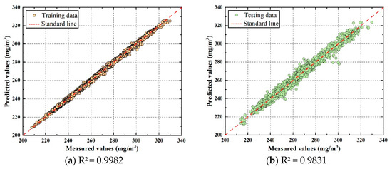 Comparison of the actual measured and predicted NOx values: (a) training dataset and (b) testing dataset.