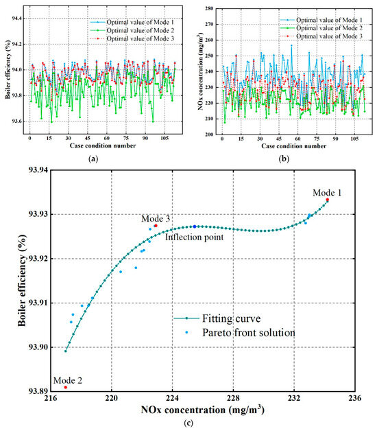 Comparison of the three optimization modes in this paper. (a) The optimization results of the three modes on the boiler efficiency under different case conditions. (b) The optimization results of the three modes on the NOx concentration under different case conditions. (c) The positions of the optimization solutions of the three modes in the frontier solution set.