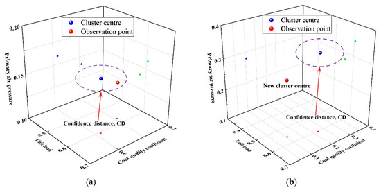 Second, the Euclidean distance between two points in space is the proximity, denoted as d, as shown in Equation (14). Then, the maximum proximity of all data samples of each operating condition in the operating condition case library to the center of that operating condition can be represented as . Next, this section defines the confidence distance (CD) as .