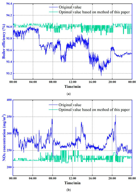 Figure 19a,b show the optimization results of Mode 1 and Mode 2, respectively; Figure 20 shows the optimization results of Mode 3. After testing, the results show that the operation optimization of the unit using the traditional data-driven model and intelligent optimization algorithm takes approximately 3 to 5 min, which obviously does not meet the real-time requirements of online combustion optimization. Since the proposed optimization method can basically obtain the optimal solution within 1 s (0.95~6.99 ms), it has an important calculation speed advantage in online combustion optimization. Finally, as shown in Figure 19 and Figure 20, the proposed optimization method can improve boiler efficiency, reduce NOx concentration, and effectively achieve the online boiler combustion optimization task.