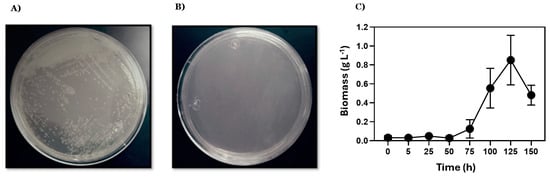 The saccharolytic activity of E. coli DH5α/pAIDA-sacA was assessed on minimal-medium agar plates with sucrose as the sole carbon source. Growth of E. coli DH5α/pAIDA-sacA at 37 °C confirmed the functionality of the AIDA-I-mediated SacA system for sucrose hydrolysis. In contrast, control plates with the pAIDA plasmid showed no growth, demonstrating that saccharolytic activity was conferred by the immobilisation of the AIDA-SacA system (Figure 1). Similarly, the strain W3110/pAIDA-sacA grew in minimal medium in 250 mL flasks, achieving a biomass concentration of up to 0.85 ± 0.26 g L−1.