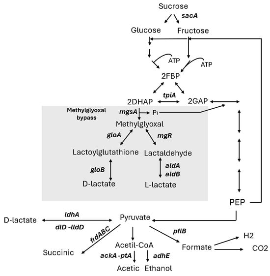 The emergence of the MG bypass appears to be a metabolic response to the accumulation of sugar phosphates, such as DHAP and GAP, during sucrose breakdown. The catabolism of sucrose through a hydrolase or phosphorylase leads to intracellular concentrations of fructose and glucose (or glucose-1-phosphate) that exceed those observed during glucose catabolism [8,15,21] doubling the formation of DHAP and GAP (Figure 3). This elevated production of sugar phosphates, particularly DHAP, serves as an allosteric activator of methylglyoxal synthase, encoded by the mgsA gene, driving the production of methylglyoxal, a highly toxic metabolite that necessitates effective detoxification mechanisms [28]. In E. coli, the MG bypass pathway mitigates MG toxicity via the glutathione-dependent glyoxalase system. Glyoxalase I converts MG and reduced glutathione into S-D-lactoylglutathione, which glyoxalase II subsequently hydrolyses to yield D-lactic acid while regenerating reduced glutathione. The resulting lactate can either be oxidised to pyruvate for respiration or excreted [24]. The MG bypass represents a low-energy alternative to the Embden–Meyerhof–Parnas (EMP) glycolytic pathway. Unlike EMP, the MG bypass consumes ATP during lactate production rather than generating it, emphasising its role as a survival mechanism rather than an energy-efficient pathway [24]. This mechanism explains why lactate production continues even after cell growth has stopped. A related process occurs during sudden shifts from low to high nutrient concentrations; under these conditions, the cells undergo an abrupt metabolic shift that leads to a rapid influx of carbon into central metabolic pathways, overwhelming glycolysis. The glycolytic pathway cannot efficiently manage the increased substrate availability, resulting in the accumulation of phosphorylated intermediates. Under normal conditions, methylglyoxal synthase is inhibited by free phosphate. However, the excessive accumulation of DHAP overrides this inhibition, triggering the activation of the bypass. As a result, excess DHAP is converted into methylglyoxal, which is detoxified through the glyoxalase system to produce D-lactate. While lactate continues to be produced under these circumstances, cellular proliferation does not occur, as the bypass primarily serves as a stress response mechanism to stabilise metabolic fluxes and prevent toxicity, rather than to support biomass synthesis [27,34,35].