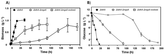 Figure 5. Impact of ldhA and mgsA deletions on (A) biomass and (B) glucose consumption in E. coli strains: WDHFAP/pAIDA-sacAldhA), WDHFAPM/pAIDA-sacAldhA ΔmgsA), and WDHFAPMEVldhA ΔmgsA evolved).
