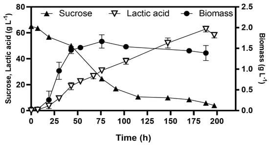 Figure 2. Homolactic fermentation of E. coli W3110/pAIDA-sacA with sucrose as the carbon source at 31 °C. The bars represent the standard deviation (n = 3).