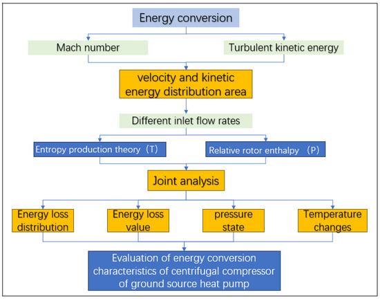 The centrifugal compressor impeller was simulated under various flow conditions using the theories of turbulent kinetic energy and Mach number. A preliminary assessment was made regarding the area of energy loss. Combined with the above two theoretical methods and the corresponding post-processing methods, the area with the largest energy dissipation in the flow channel was analyzed by using the entropy generation theory, and its distribution law was studied and quantitatively evaluated. The relative energy rotor enthalpy was used to analyze the energy change trend of the working fluid throughout the entire flow channel. Based on the variation in Rothalpy, it was determined whether the fluid microgroup gains or loses energy. At the same time, according to the theory of entropy generation, entropy generation can reflect changes in temperature to a certain extent, and in thermodynamics, entropy and temperature are tied concepts. Temperature and pressure are key parameters for Rothalpy and entropy generation, respectively, which directly reflect compressor performance. Therefore, a combined analysis method integrating entropy generation and relative energy rotor enthalpy can be developed to assess the energy conversion in centrifugal compressor impellers used in ground source heat pumps. The specific research methodology is shown in Figure 1.