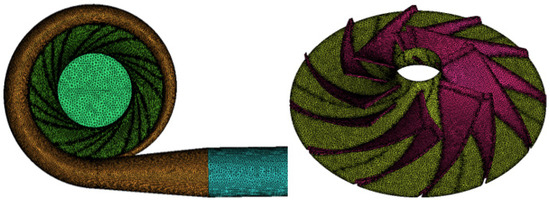 This study primarily concentrates on analyzing the flow characteristics and energy loss distribution within the impeller section using an unstructured mesh generated by ICEM (ANSYSY 2023 R1). To ensure the accuracy of the simulation results, local mesh refinement has been applied to the impeller blades. For the other sections, a low-density mesh was used wherever possible to maintain computational accuracy. The total number of grids was 3.34 million, with 1.64 million grids allocated to the impeller section. Following grid independence tests conducted at four different grid densities (2.41 million, 2.80 million, 3.34 million, and 3.76 million), it was determined that from 3.34 million grids onward, any increase in grid count resulted in less than a 3% change in the compressor’s efficiency characteristics. Moreover, under the current grid configuration, the maximum difference in mass flow rate between the inlet and outlet across various operating conditions was merely 0.083 kg. Consequently, the chosen grid count not only satisfies the computational requirements but also ensures the accuracy of the calculations. The overall compressor mesh model and the impeller mesh model are shown in Figure 3.