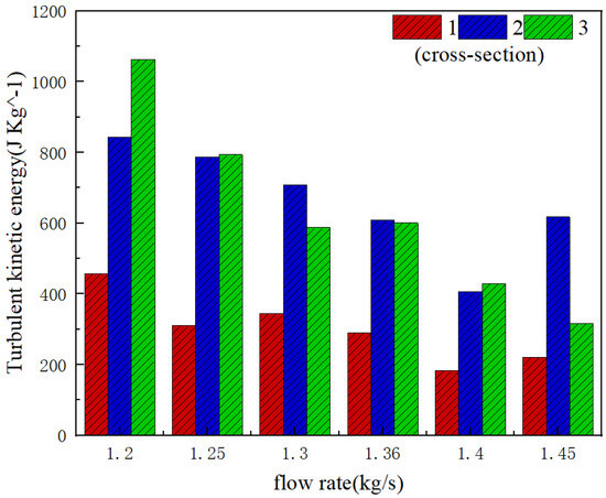 The flow rate of the compressor is modified based on the given simulation boundary conditions in order to investigate the impact of the flow rate on the turbulent kinetic energy of the fluid. Figure 5 and Table 2 display the highest values among the three cross-sections of the centrifugal impeller, represented by a column chart and a numerical table. (5%, 50%, and 90% blade height in cross-Sections 1, 2 and 3, respectively).