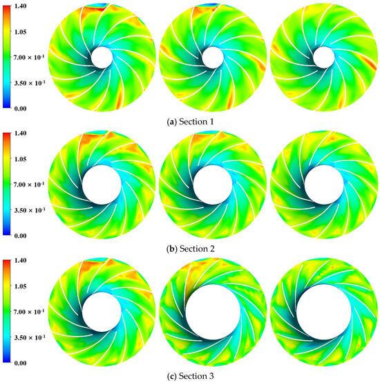 Based on its definition, turbulent kinetic energy indicates the intensity of velocity fluctuations and is intimately linked with the velocity field. Therefore, Figure 8 illustrates the Mach number profiles across different sections under three typical operating conditions. The impeller’s Mach number is determined by the ratio of the circumferential velocity at the impeller’s exit to the local speed of sound, acting as a critical design parameter for centrifugal compressors. The flow inside the compressor is generally considered compressible, meaning that gas density changes with variations in pressure and temperature. If the Mach number of the refrigerant within the impeller exceeds 1, the fluid will travel at supersonic speeds, causing wave drag losses. This occurs when the refrigerant’s velocity reaches the speed of sound, leading to overlapping transport waves and generating compression waves. These compression waves significantly impede the flow of the refrigerant, resulting in substantial flow losses.