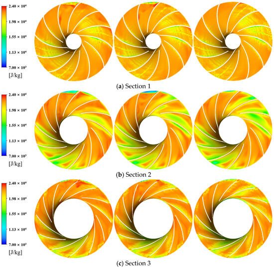 As shown in Figure 10 and Figure 11, at a constant blade height, the increase in the flow rate leads to a less significant distribution of entropy generation loss. Simultaneously, a region of higher entropy can be observed on the suction side of the blade near the trailing edge, which is associated with the flow losses resulting from the impeller’s rotation. Additionally, consistent with the findings of Zhang et al. [15], the high-entropy zone at the same blade height remains consistently positioned directly above, i.e., near the tongue, and this does not change with variations in flow rate. This location aligns closely with the distribution of turbulent kinetic energy, providing a clearer indication of where energy losses occur within the impeller’s flow passage.