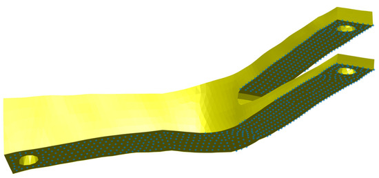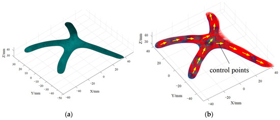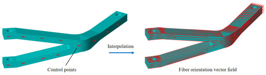 The final designed part can be represented by a tetrahedral mesh , where V and T are the collections of vertices and tetrahedrons. The FOVF embedded on the part can be generated manually. Let us first select several vertices at the boundary of the part as the control points, as shown in Figure 2, and the fiber orientation at these control points can be defined manually. An interactive software tool can be designed to let the user set the fiber orientation freely at the control point according to their experience. Then, the FOVF at the entire mesh can be obtained by interpolation. Assuming is the vector of at the ith vertex, it can be calculated by