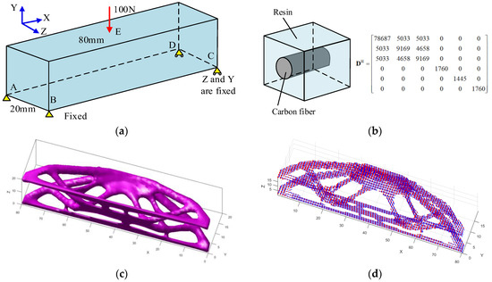 where represents the element density design variables, while and are fiber orientation angle variables, where N is the number of elements. The compliance is set as the objective function, which is written as the product of the displacement vector and the external force vector . The optimization model satisfies the volume constraint , where is the design volume, is the original volume of the design domain, and f (0 < f < 1) is the prescribed volume fraction. The second constraint is the static equilibrium equation, where is the total stiffness matrix. A detailed description of this model can be found in [15]. Figure 3 shows an example of topology optimization of an FRC structure; the design domain (20 mm × 20 mm × 80 mm) and the boundary condition are shown in Figure 3a. As accurately modeling the FRCs is out of the scope of this paper, we use linear elastic assumption to approximately predict the mechanical behavior of the FRC parts. The homogenization method is employed to calculate the elastic matrix DH of the anisotropic material, which is then used in topology optimization and finite element analysis, as shown in Figure 3b. The final optimized topology structure and the FOVF are shown in Figure 3c,d, respectively.