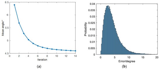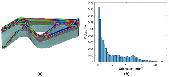 where is a sparse matrix of 3m × (m + n) that contains all the coefficients of the equations. As 3m > , an exact solution to Equation (6) does not exist. In this paper, a heuristic algorithm is proposed to approximately find both and , as shown in Algorithm 1; the algorithm contains an iteration loop. At each iteration, the Poisson equation is solved to find an intermediate , and is estimated by . Then, is modified by for the next iteration, where is the mean of . The angle error is defined as the included angle between and . The loop stops when the mean angle error is no longer decreasing. Figure 5a,b show the curved sliced layers of the printing volume and the printed part, respectively. The nozzle orientation error at the ith tetrahedron is defined as the included angle between and . Figure 6a shows the iteration curve of Algorithm 1; after 14 iterations, the mean nozzle orientation error finally converges to 4.58°. Figure 6b shows the histogram of the nozzle orientation errors, which means that the sliced curved layers are approximately perpendicular to the NOVF . However, due to the nature of Equation (7), the nozzle orientation error cannot be totally eliminated.
