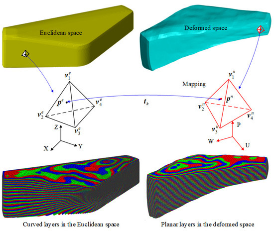 Another two scalar distance fields, and , induced by the vector field and , can also be calculated by solving Equation (6). The three mutually orthogonal distance scalar fields (, , and ) generate a deformed space , and there exists a mapping between the deformed space and the Euclidean space, as shown in Figure 7. For any point in the deformed space , a mapped counterpart point in the Euclidean space can be found. The nearest tetrahedron to or can be found by using the kd-tree searching algorithm, assuming the coordinates of the vertices of in the Euclidean space and the deformed space are and , respectively. Then, or can be calculated by
