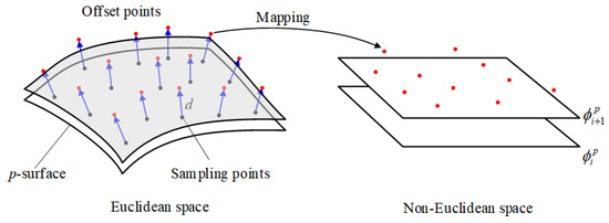 The layer thickness is no longer uniform for each curved layer. Thus, the distance for every two adjacent planar surfaces in the deformed space should be adjusted to ensure that the maximum Euclidean distance between the two curved surfaces is smaller than a prescribed value. An adaptive slicing algorithm is proposed to control the thickness of the curved layers. As shown in Figure 8, for the ith p-surface of in the Euclidean space, several sampling points are first planned and offset along their normal directions with a distance d. These offset points are mapped to the deformed space. Then, the minimum p-value of the mapped points can be used to interpolate the next curved layer, and the maximum Euclidean distance between the two surfaces will be the offset distance d.