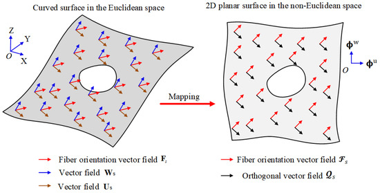 As discussed in Section 2.3, the curved surface in the Euclidean space can be mapped to a 2D planar surface in the deformed space , and the fiber orientation vector field can also be mapped to at the 2D planar surface. To avoid some geometry problems at the curved surface, the continuous printing path is planned at the 2D planar surface in the deformed space , and the real multi-axis printing path at the curved surface can be obtained by the inverse mapping process. As shown in Figure 9, at the 2D planar surface, is rotated around the surface normal vector (0, 0, 1) by 90° to obtain a new vector field . A scalar field induced by the vector field can be found by solving the following optimization problem defined on the triangular mesh of the 2D surface: