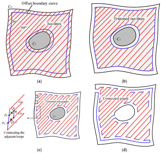 An algorithm is developed to connect the interpolated iso-lines to a Eulerian graph that must contain a continuous path. As shown in Figure 10a, the iso-lines of the scalar distance field are first interpolated and the sampling interval is . The boundary contours (C0, C1, C2, …) of the region are offset inward with a distance of to obtain offset contours (S0, S1, S2, …). Then, the iso-lines are trimmed by the offset contours to form an undirected graph, as shown in Figure 10b. For each offset contour Si, all the intersection vertices along Si are numbered one by one (1, 2, 3, …, 2n). Then, by deleting all the edges between vertices P2k−1 and P2k (k = 1, 2, 3, …), the degree of each vertex becomes 2, as shown in Figure 10c. The trimmed graph contains several connected Eulerian sub-graphs, which can be identified by using the Depth-First Search algorithm. These sub-graphs should be connected without increasing the degree of the vertices. For every two adjacent sub-graphs that contain the intersection vertices Pk and Pk+1, two vertices Qk and Qk+1 on the path edges that are connected to Pk and Pk+1 are built, and the distance Lk between Pk and Qk can be calculated by , where is the included angle between the boundary edge and the path edge. Finally, the two adjacent sub-graphs can be joined by connecting Pk to Pk+1 and Qk to Qk+1 and by deleting edges PkQk and Pk+1Qk+1. A connected graph can be formed by connecting all the adjacent sub-graphs, as shown in Figure 10d, and a totally continuous printing path can be obtained by using the classical Fleury algorithm to traverse the connected Eulerian graph.
