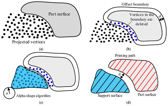 Generation of the support surface: (a) projected vertices and part surface; (b) offset boundary of the part surface; (c) use the alpha-shape algorithm to generate support surface; and (d) plan the printing path on the support surface and the part surface.