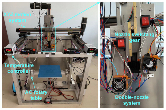The proposed multi-axis printing process planning method was implemented in C++ and run on a desktop with an Intel i7 CPU. Figure 15 shows our homemade five-axis double-nozzle 3D printer. Section 3.1 uses two examples to validate the vector field-driven continuous printing path planning algorithm. In Section 3.2, four FRC structures with defined FOVFs are shown to be successfully printed using our curved-layer slicing and support generation methods. The printing parameters are shown in Table 1.