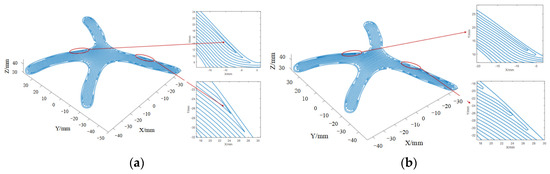 Continuous printing path based on the planned vector field: (a) the continuous path without optimizing the path interval and (b) the continuous path after optimizing the path interval.