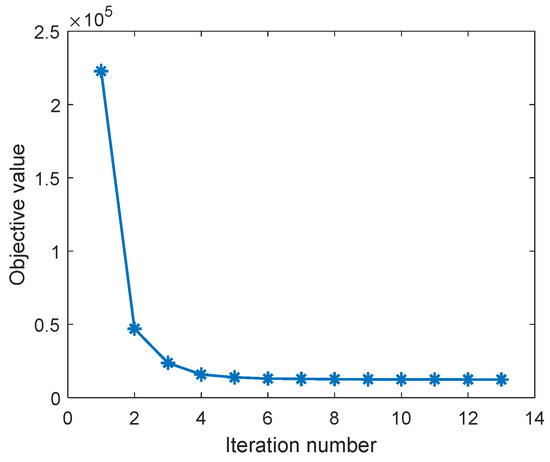 Figure 16a shows the triangular mesh of a curved surface; the number of vertices and faces are 2341 and 4278, respectively. A few vertices are chosen as the control points, and the vectors at the control points can be planned manually, usually along the skeleton of the curved surface; then, the vector field on the entire surface can be calculated by Equation (3), as shown in Figure 16b. The path planning method proposed in Section 2.4 is used to generate a continuous path that is aligned with the defined vector field. Figure 17a shows the planned path without optimizing the path interval. It can be found that the printing paths are very close at certain places, which may lead to material redundancy. The printing path interval is then optimized by solving the optimization problem in Equation (10). Figure 18 shows the iteration curve of the optimization; it can be seen that the objective function quickly converges to a constant after 5 steps. The final optimized printing path is shown in Figure 17b; it can be found that the path overlap is effectively reduced, and the path interval is a constant. The path optimization algorithm adjusts the path intervals to avoid narrow clearances between adjacent paths. After optimization, the total path is smoothed using the Laplacian smoothing method. However, this process may lead to shrinkage at sharp 180° turns as the smoothing tends to reduce the size of these corners. This is a limitation of our method. One possible solution to this problem is to use a more advanced smoothing algorithm that better handles shrinkage at 180° turns.