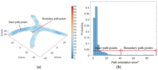 Path orientation error: (a) path orientation error at different places and (b) histogram of the path orientation error.