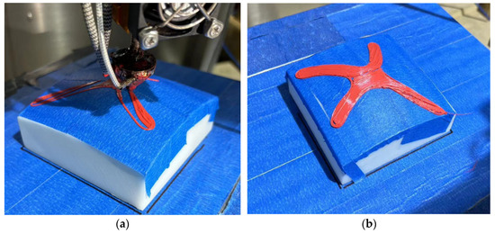 Physical printing of the vector field-driven continuous path on the curved surface: (a) printing process and (b) final printed curved surface.