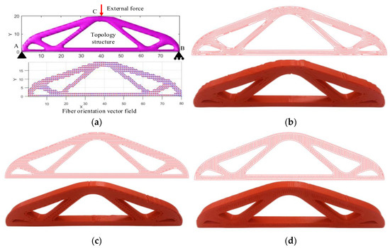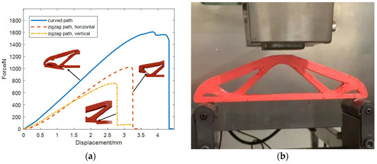 Another example is a 2D topology truss structure with an optimized FOVF, as shown in Figure 21a. It can be found that the optimized FOVF is aligned with the truss beams. Based on the 2D triangular mesh of the topology structure and the FOVF, a continuous printing path is planned by using the proposed path planning method. As shown in Figure 21b, the printing path width is 1 mm, and the layer thickness is 0.5 mm. After repeating the printing of 20 layers with the same path, the final thickness of the part in the Z direction is 10 mm. We also printed the 2D topology structure with conventional zigzag paths of different angles (0° and 90°, as shown in Figure 21c,d, respectively) and conducted compression tests to verify that the part with the optimized FOVF has superior mechanical strength (see Figure 22).