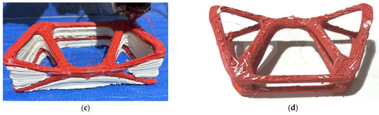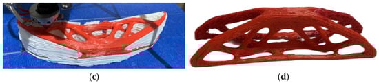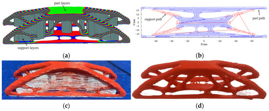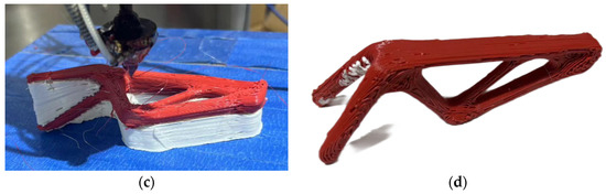 The traditional three-axis planar slicing process and the multi-axis curved slicing process proposed in this paper are used to print the 3D FRC structure shown in Figure 3. As shown in Figure 23a, the 3D truss structure (160 mm × 40 mm × 40 mm) is sliced into planar layers with a thickness of 0.6 mm. Continuous zigzag paths along the X-axis are planned at each planar layer, as shown in Figure 23b, and the path width is set to 1 mm. Figure 23c shows the printed part with supports, and Figure 23d shows the printed part after removing the supports. Although the truss structure was successfully printed, the printing paths were not aligned with the optimized FOVF; thus, the printed part might not reach the expected mechanical strength.