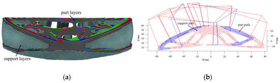 Support structures must be needed when printing parts with overhang features. In this section, a support structure generation method for curved-layer slicing is proposed. In the deformed space , the support regions of the printed part can be identified by the overhang angle (the included angle between the surface normal direction and the z-axis (0, 0, 1)). As shown in Figure 12, the vertices whose overhang angle is larger than the critical angle (usually 135°) are marked in blue, and support structures are needed at these regions; let us name the set of vertices as . Then, the support region at the ith p-plane of can be obtained by projecting the vertices in that are above the p-plane, and the projected points that are outside the printing volume domain and inside the printed mesh should be deleted. To ensure the shape accuracy of the support surfaces, the face length of the triangular mesh of the part should be smaller than the path interval.