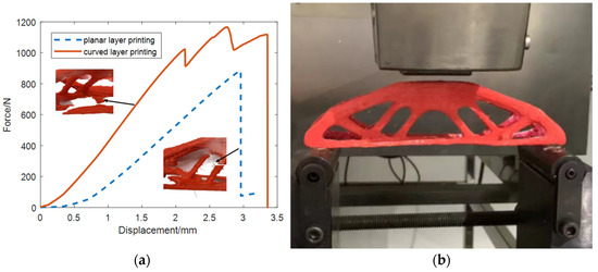 Figure 24a shows the curved sliced layers of the 3D truss structure and the support structures generated by our method. The curved layer thickness and printing path width are the same as that of three-axis printing. We first generate the printing orientation vector field that is orthogonal to the FOVF. Then, a deformed space is built based on three mutually orthogonal vector fields, where the printed part is sliced into planar layers and the support structures are generated through three-axis printing. Finally, the curved sliced layers in the Euclidean space are obtained by the inverse mapping process. At each sliced curved layer, printing paths are planned according to the projected FOVF, which not only ensures that the paths are aligned with the FOVF but also generates a single-stroke continuous path. Figure 24b shows the printing paths at a curved layer. The final printed part and the part after removing the supports are shown in Figure 24c,d, respectively. The mechanical strengths of the two printed parts were also tested on our press machine, as shown in Figure 25. The structure follows a typical three-point bending topology, with a vertical load applied at the center of the part. It can be observed that the part printed using the proposed method exhibits higher stiffness. Our multi-axis curved layer printing process ensures the printing paths are aligned with the optimized FOVF; thus, the printed part shows superior strength compared to the part printed by the traditional three-axis planar printing process.