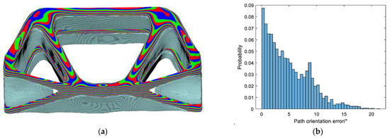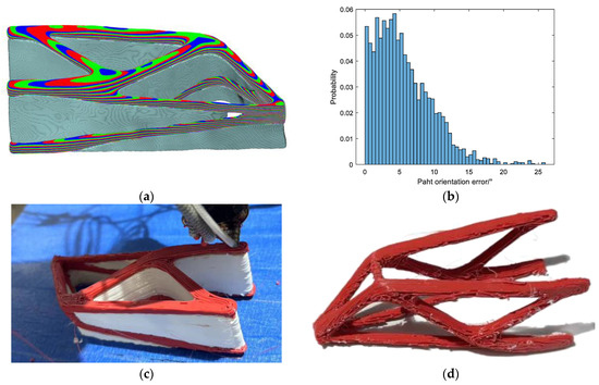 Another three FRC structures with FOVFs obtained by topology optimization are shown in Table 2, and they were also successfully printed by using our curved-layer slicing and vector field-driven continuous path planning methods, as shown in Figure 26, Figure 27 and Figure 28; the dimensions of the three parts are 120 mm × 60 mm × 40 mm, 120 mm × 40 mm × 40 mm, and 1220 mm × 40 mm × 40 mm, respectively. The surface quality of the printed parts is not very good due to the low precision of the homemade machine and the effect of the supports, which might be improved by adjusting the printing parameters such as path width and layer thickness. Due to the limited experimental conditions, the parts were printed by a homemade FDM five-axis printer. The surface quality is not very good due to the low precision of the machine and the effect of the supports, not due to the proposed slicing and path planning methods. The mean path orientation errors of the three structures are 4.88°, 5.59°and 4.92°, respectively (see Figure 26b, Figure 27b and Figure 28b). As discussed before, both the curved slicing surfaces and the printing paths cannot be strictly aligned with the defined FOVF unless the FOVF is divergence-free. The deviation between the real path orientation and the theoretic fiber orientation may weaken the mechanical strength of the printed part.