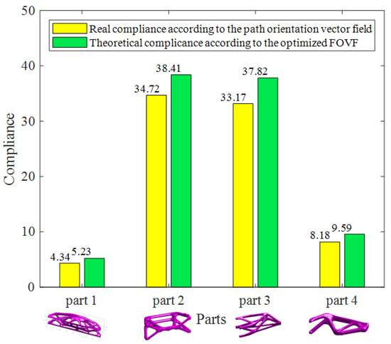 Figure 29 compares the real and theoretical compliance of the four structures; the structural compliance calculated according to the real path orientation vector field is slightly weaker than the theoretical compliance. It is important to note that fiber orientation has a significant impact on the structural strength of the part. Due to the inherent limitations of the method, the printing path orientation cannot be perfectly aligned with the design fiber orientation, which leads to a reduction in structural stiffness. This limitation might be solved by concurrent optimization of the structure and the path process, which will be our future research topic.