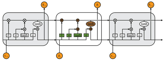 - Forget gate:The forget gate determines whether the information from the previous time step should be retained or discarded. Based on the current time step input and the previous hidden state, the forget gate outputs a value between 0 and 1, which dictates how much of the past information should be forgotten. A value closer to 0 means that more information will be discarded, while a value closer to 1 indicates that more information will be retained. This mechanism allows the LSTM to selectively forget irrelevant information and focus on relevant patterns. The mathematical expression of the forget gate can be expressed as follows:where is the output of the forget gate, is the hidden state from the previous time step, is the input at time t, is the weight matrix, is the bias matrix, and denotes the sigmoid activation function, which can be expressed aswhere x represents any input variable.