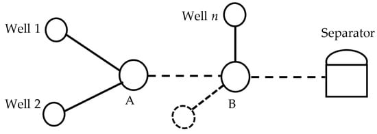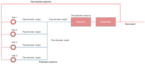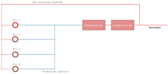 The corresponding gas production and liquid production under the gas injection rate of each well, considering the mutual interference between gas lift wells, can be solved by using the gas lift performance curve according to the principle of node analysis. For example, assume there is a gas lift well production system consisting of n wells and a separator, as shown in Figure 4.