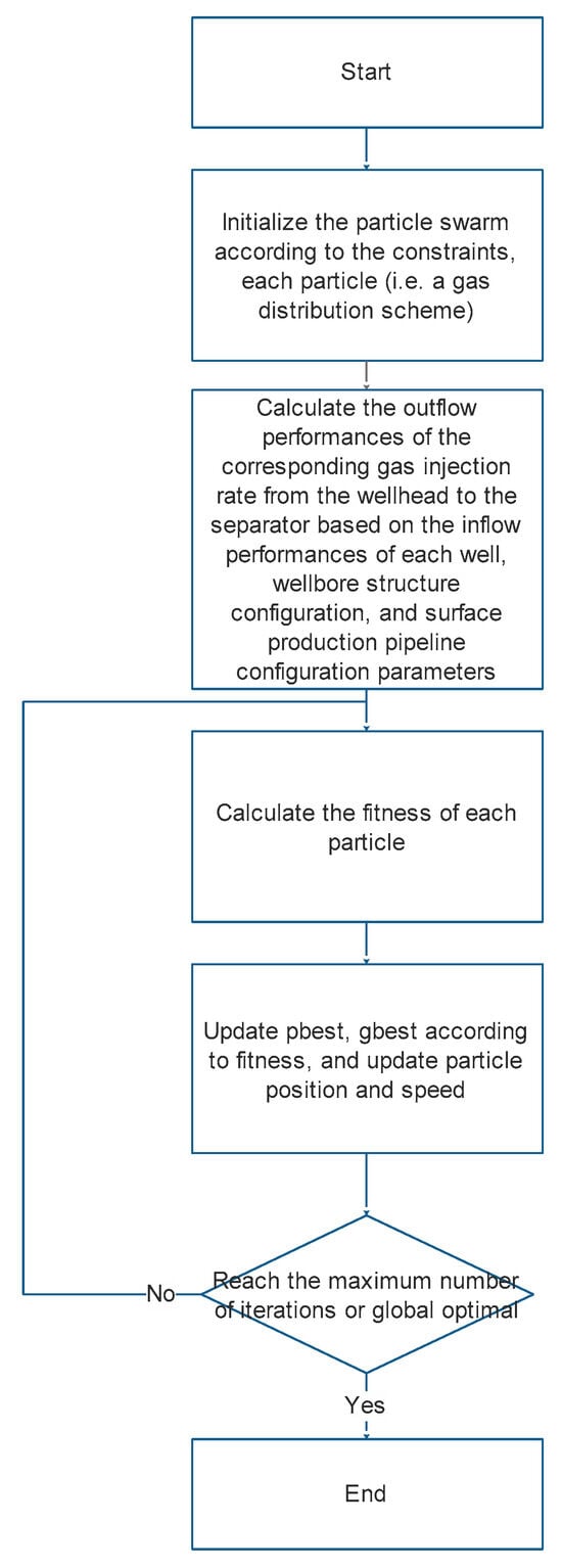 In order to solve the above model, the particle swarm optimization algorithm (PSO) is used for optimization. The generated gas distribution plan for multiple wells on the platform is one of the particles, which is optimized according to the particle swarm optimization algorithm. The optimization method is shown in Figure 3 below. According to the inflow performance parameters and wellbore structure configuration, the gas lift performance curve under different wellhead oil pressures can be calculated. Based on the surface pipeline network configuration parameters, the corresponding outflow performances under coordinated wellhead oil pressures can be calculated for each well.