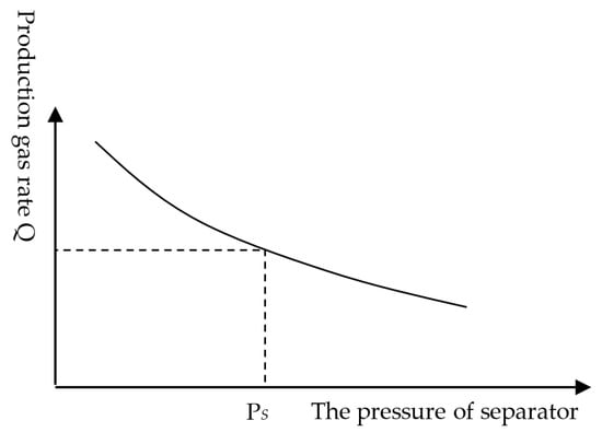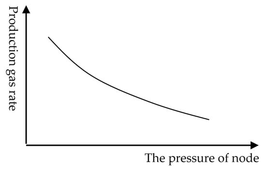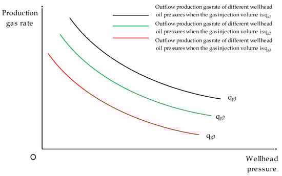 Considering surface gathering and transportation pipelines, there is mutual interference between wells. The separator pressure is constant as a boundary condition. When the surface gathering and transportation pipeline pressure fluctuates, it will affect the gas production and liquid production of the gas well. The relationship can be represented by the relationship curve between wellhead pressure and gas production under different gas injection rates, as shown in Figure 5. According to the principle of node analysis, this curve is the inflow curve with the wellhead as the node.