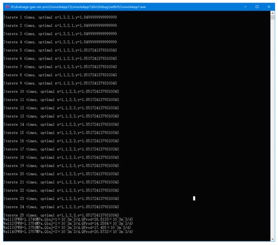 The particle swarm algorithm is used to optimize based on the established model and set parameters. The separator pressure is 0.5 MPa. The simulation results are shown in Figure 22 and Table 2 below. It can be seen that compared with the total gas production without gas injection (Table 1), the gas production increases in a manner close to the optimal gas distribution, the overall production efficiency is significantly improved and the optimization goal is achieved. From the results, it can be seen that the wellhead pressure varies among different wells, but, due to the close distance, the production of liquid and gas is not particularly high, so the difference in the wellhead oil pressure is not significant.