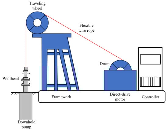 When a low-permeability oilfield enters the middle and late exploitation stage, the liquid production of a single well gradually decreases [1]. For this reason, the flexible ultra-long stroke pumping unit (FULSPU) system, which has the advantages of long stroke, low stroke, simple structure, small load impact, and high overall efficiency, has gradually been widely used in the old oilfields [2,3,4,5,6,7].