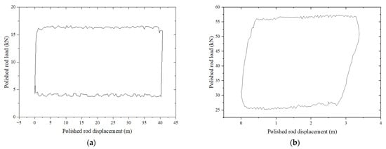 However, according to the analysis above, for an FULSPU, the stroke length is longer, the stroke frequency is lower, and the calculated acceleration coefficient is about 5 × 10−4, i.e., the ratio of the dynamic load to the total load is about 0.05%. As a comparison, for a conventional beam pumping unit, the stroke and number of strokes are 3 m and 6 min−1, respectively, with a dynamic load ratio of 6.03%. In addition, the acceleration and deceleration intervals of the flexible ultra-long-stroke pumping unit are small, and the uniform motion time is long, so the dynamic load can be ignored. In addition, in the measured load diagram of the polished rod, the polished rod load is more stable during the up and down stroke, and there is no obvious difference between the load value of the variable-speed section and that of the uniform-speed section, which also proves that the dynamic load accounts for a smaller proportion of the total load. These can be obtained from the polished rod load diagram for FULSPU and traditional beam pumping unit as shown in Figure 3.