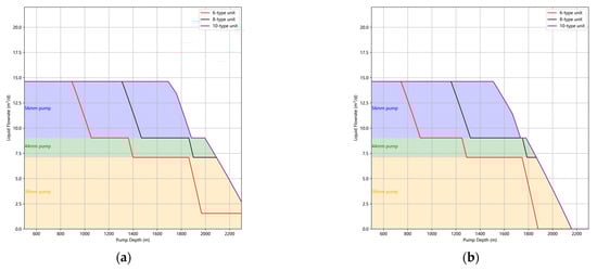 To obtain the FULSPU optimization selection chart by the Python-based program, different pump hanging depths, different types of pumping pumps, and pumping units under the conditions of the liquid production are plotted, as shown in Figure 6.