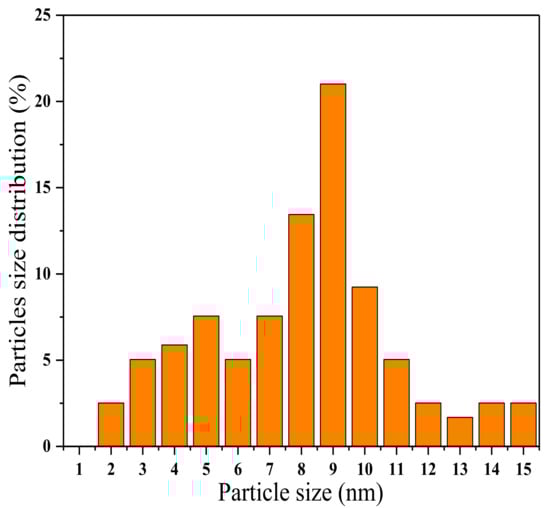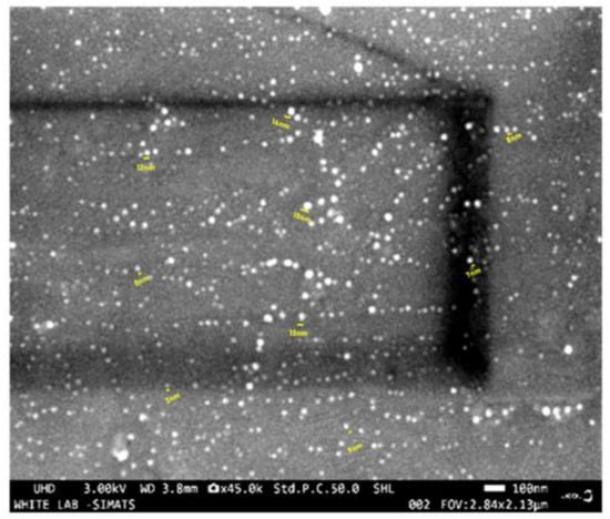 The morphology and size of the BRS-CNDs were confirmed using NanoSEM. Figure 2 and Figure 3 display the SEM micrographs and size distribution histogram of the BRS-CNDs, respectively. It was confirmed that their size regimes were in the range of 2–15 nm. Earlier reports [,], also document the successful extraction of small-sized CNDs from smoke/soot as well.