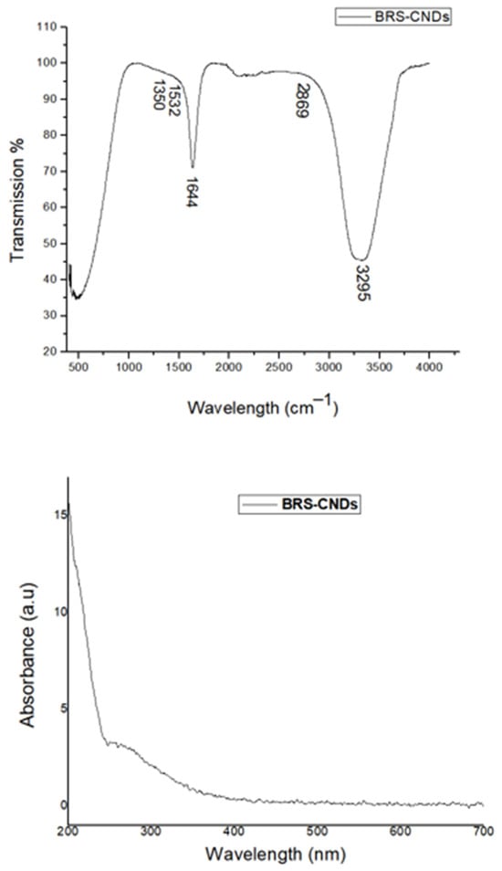 The chemical characterization of the extracted nanocarbon to ascertain the chemical nature of the nanodots was carried out using FTIR and UV-Vis spectrophotometry (Figure 4A). The FT-IR spectrum of BRS-CNDs shows two significant peaks merged with small weak vibrations located in the 3400–2800 cm−1 region. The broad and merging peaks at around ∼3497 and ∼3295 cm−1 correlate with the −NH and −OH stretching vibrations, respectively. The peaks at around ∼2920 and 2869 cm−1 belong to (−C−H) stretching vibrations. A weak peak at ∼3080 cm−1 is characteristic of (=C−H) stretching vibration. A sharp peak at around ∼1644 cm−1 is used to recognize the presence of (C=O/C=N) stretching vibrations of the nitrogenous amide group; the peak at 1532 cm−1 represents (O=C−NH/C=C) stretching vibrations. The smaller peaks at ∼1454 and ∼1350 cm−1 help to correspond to the (−C−N) stretching vibration and −C−NH stretching vibration, respectively []. These are characteristic of carbon nanomaterials. The UV-Vis spectroscopic results showing absorption peaks from 206 nm to 280 nm confirm the presence of carbon nanoparticles as well (Figure 4B).