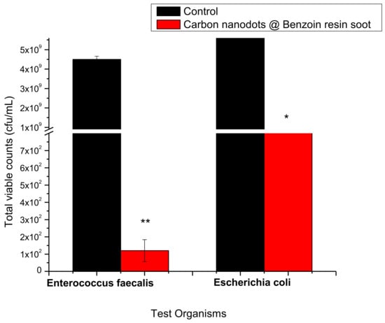 The results of the antimicrobial tests confirmed the anti-coliform activity of the BRS-CNDs. Figure 5 displays the results of the plate count method, where a statistically extremely significant inhibition of the coliform bacteria E. faecalis was observed, while E. coli inhibition rates were relatively lesser than that of E. faecalis but still were statistically significant.