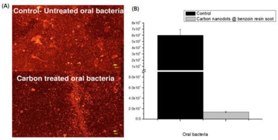 The results of the anti-oral bacterial tests proved the antibacterial activity of BRS-CNDs. As observed from Figure 6A,B, significant inhibition of oral bacteria was evidenced, confirming the anti-oral bacterial activity of CNDs.